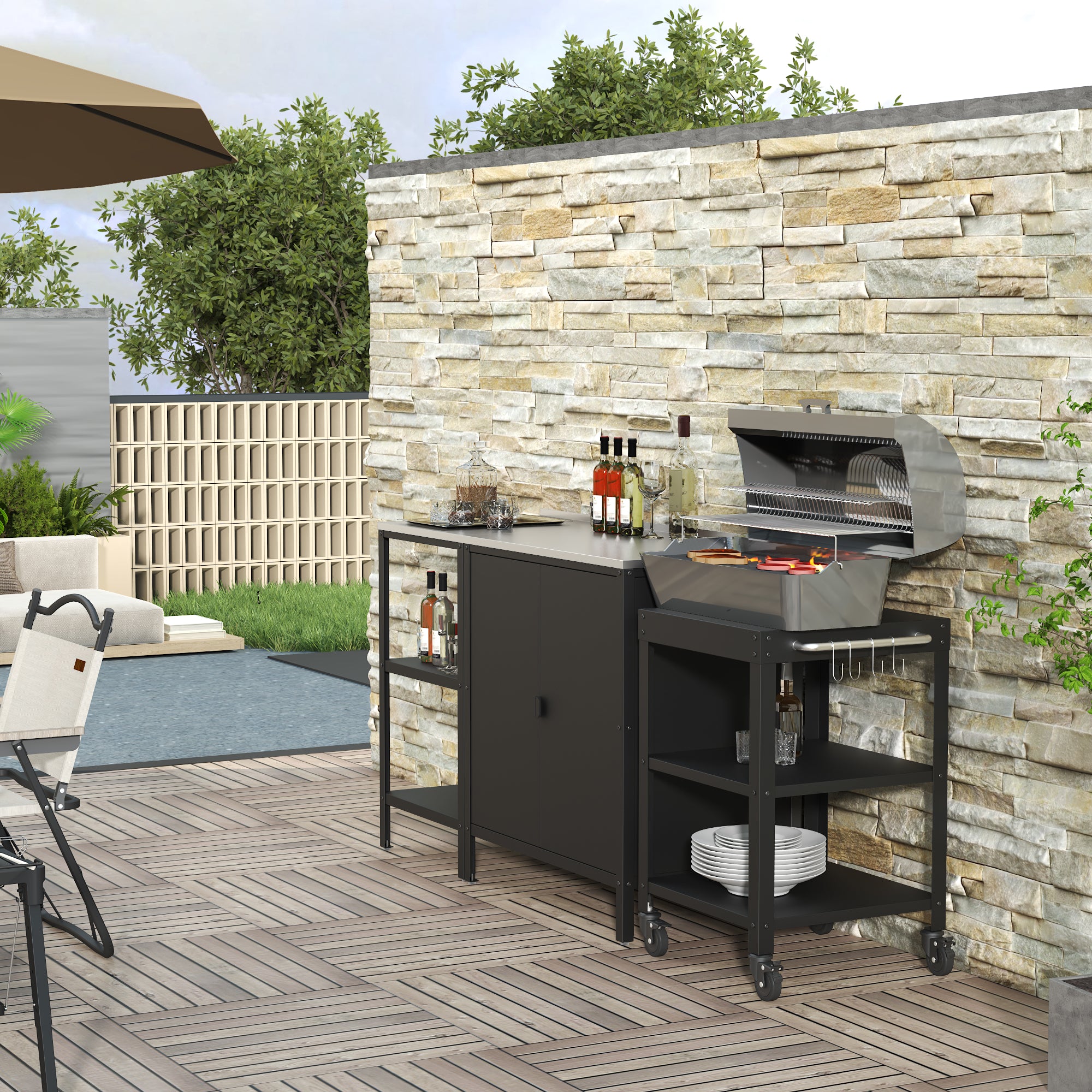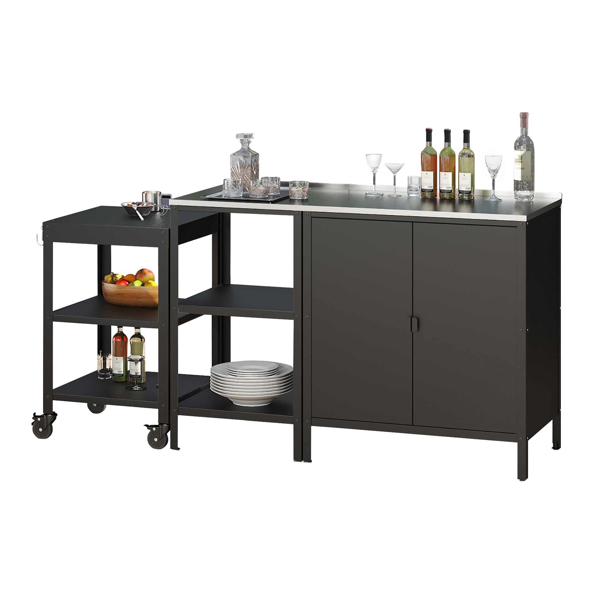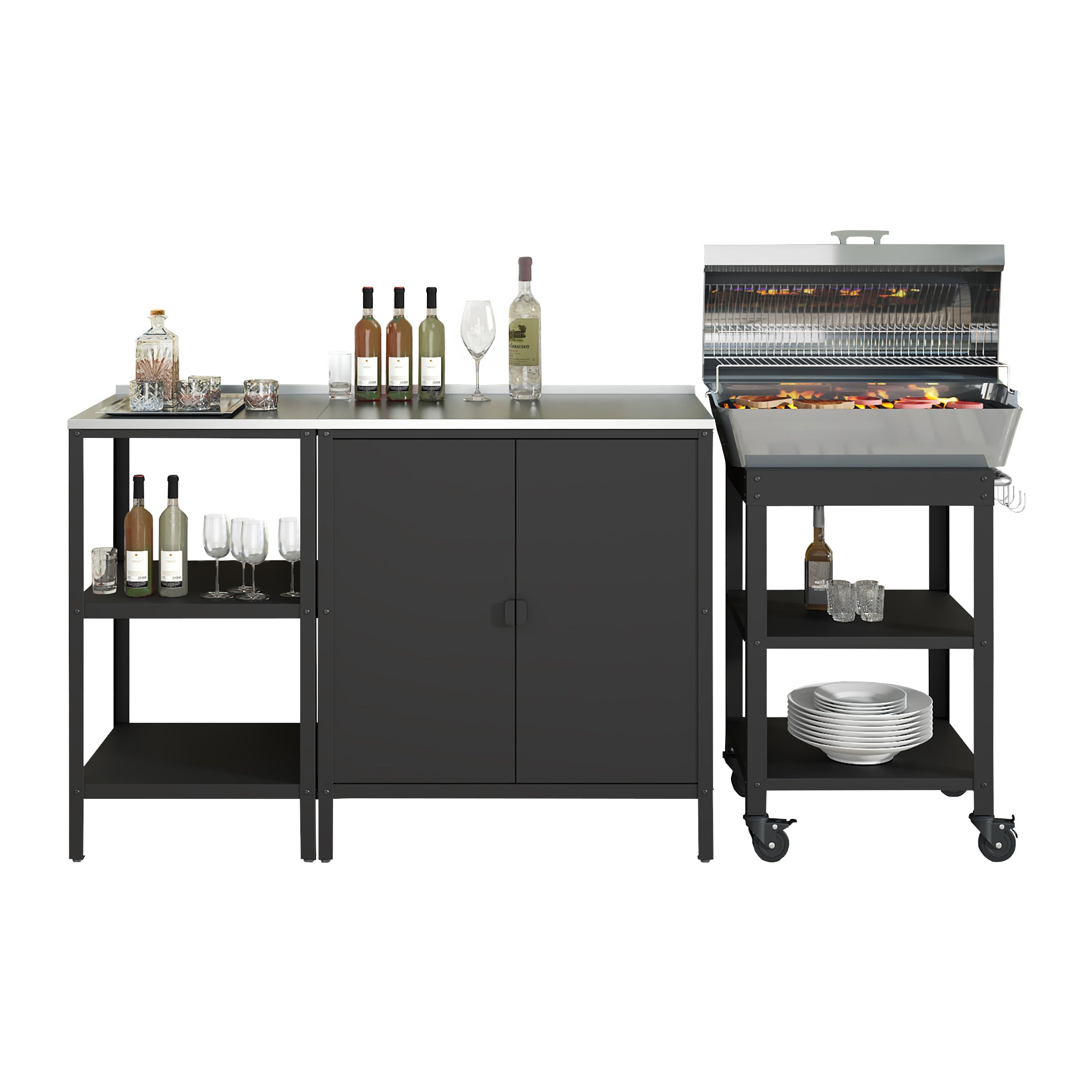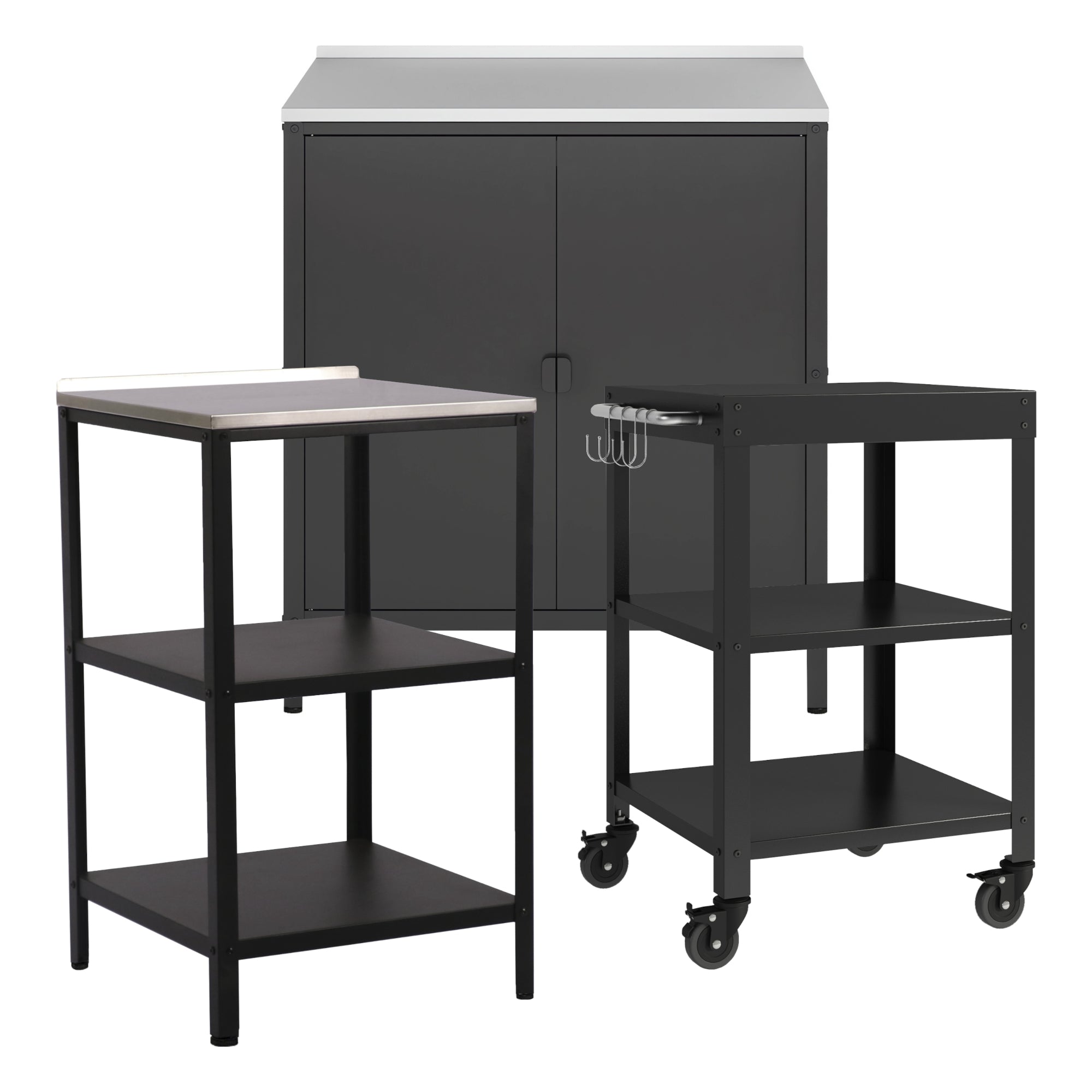 De driedelige tuinmeubelset is de perfecte aanvulling voor je tuin, terras of balkon. De set bestaat uit een kast, een rek en een serveerwagen en biedt voldoende opbergruimte voor allerlei spullen. Alle drie de meubelstukken zijn speciaal ontworpen voor buitengebruik en gemaakt van weerbestendig materiaal. Het stijlvolle en praktische rek is voorzien van drie ruime legplanken en kan ook als werktafel worden gebruikt. De bijpassende tuinkast beschikt over twee deuren en een extra plank aan de binnenkant. De serveerwagen is voorzien van vier soepel rollende wielen en maakt het verplaatsen eenvoudig – ideaal tijdens tuinfeestjes of barbecues.