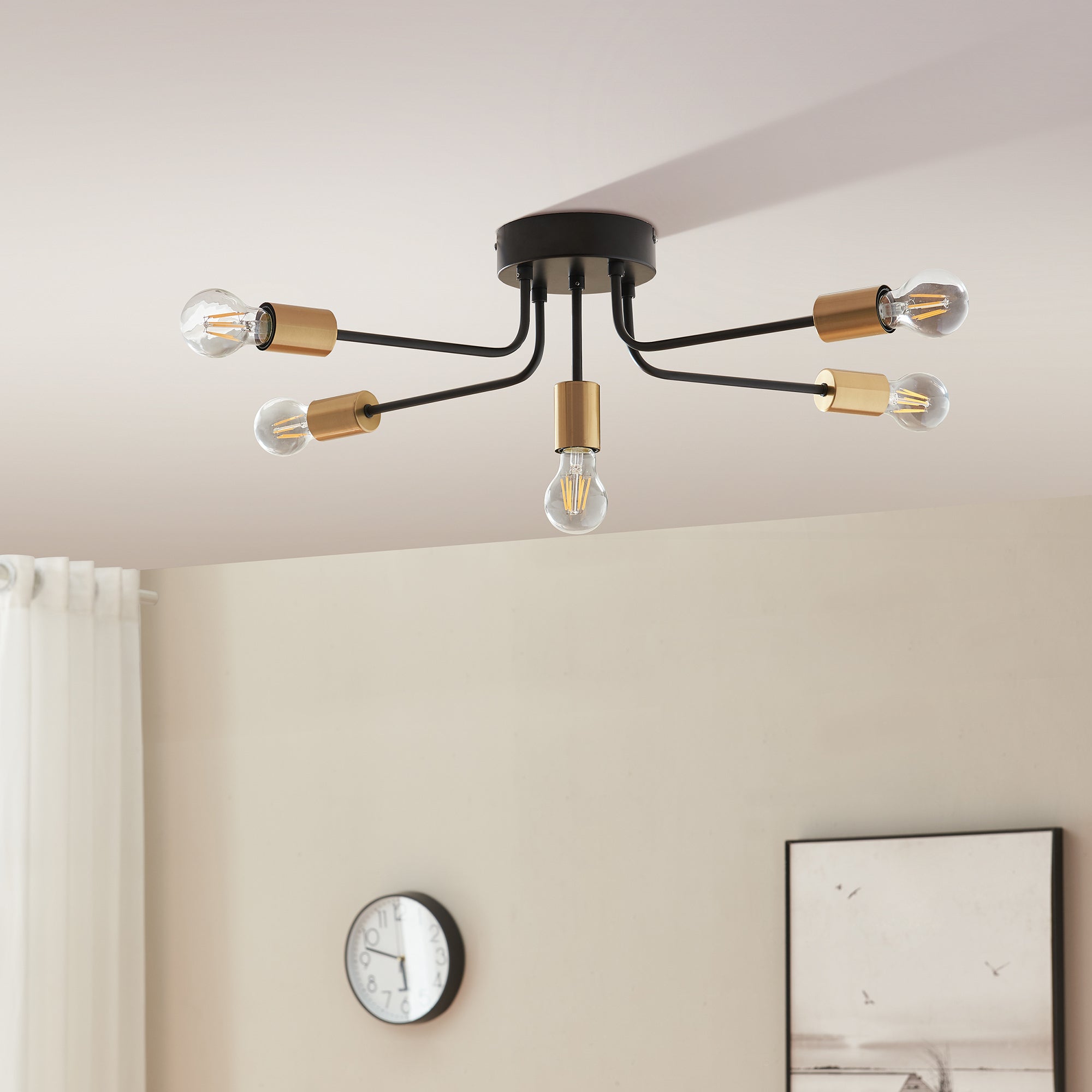 De plafondlamp is uitgerust met vijf elegant gebogen armen die zorgen voor een gelijkmatige lichtverdeling. Aan het uiteinde van elke arm bevindt zich een lampenfitting die stevig op zijn plaats zit en zo een betrouwbare werking garandeert.