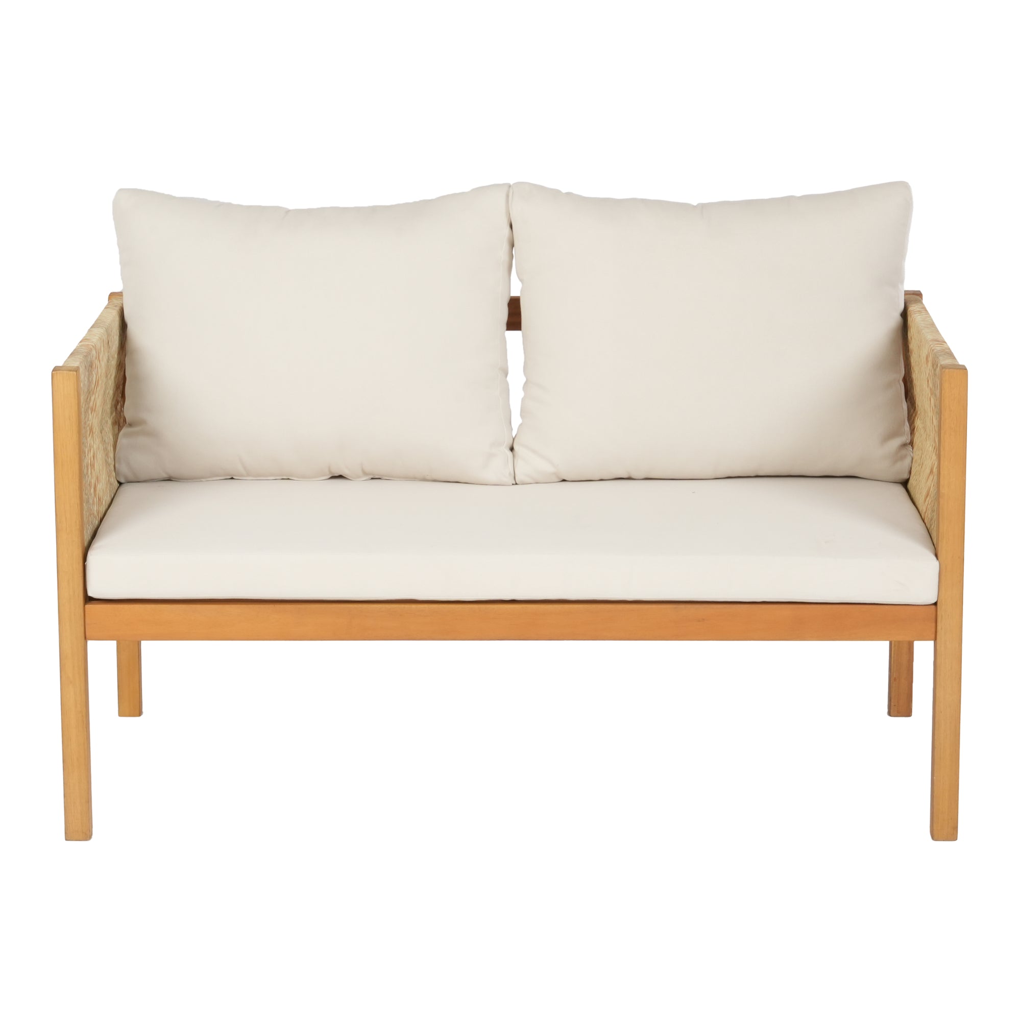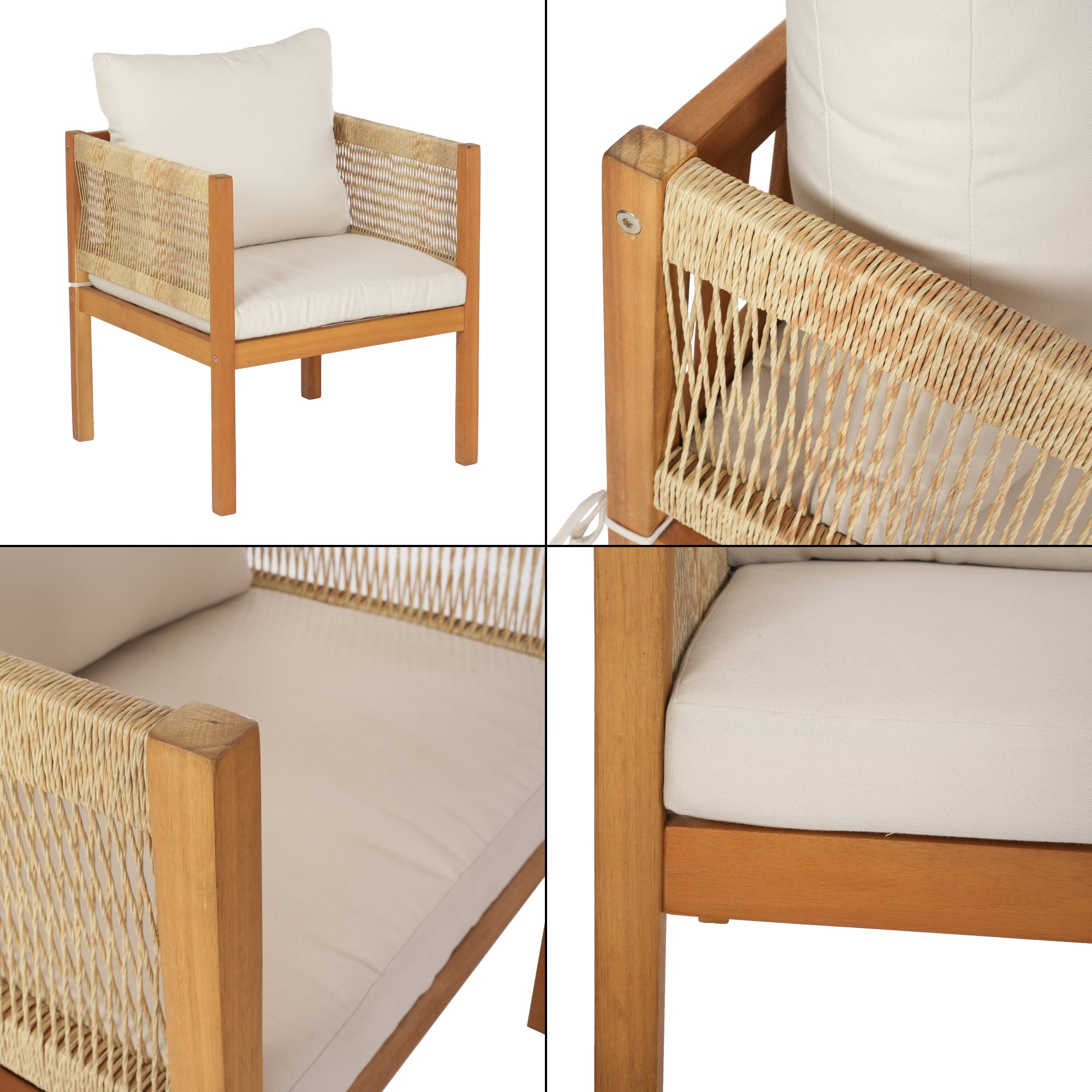 - Acaciahout, polyrotan en stof (70% katoen, 30% polyester)