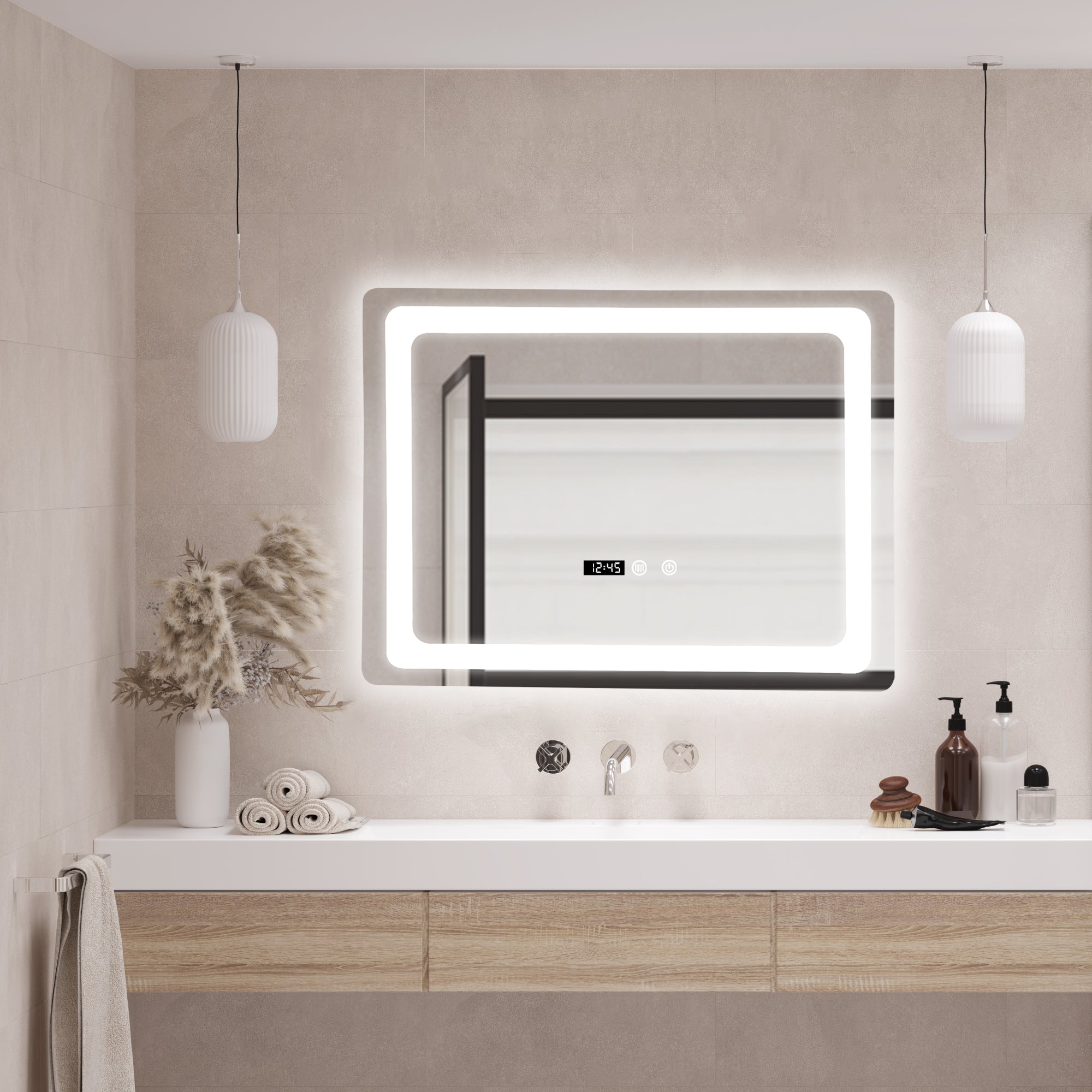 Notre miroir stylé crée une ambiance agréable dans votre salle de bain. Équipé de trois niveaux d'éclairage - blanc chaud (3000 K), blanc neutre (4500 K), blanc froid (6500 K) - il s'adapte parfaitement à vos besoins. Son fonctionnement est très simple, l'interrupteur tactile vous permet de l'allumer et l'éteindre en un rien de temps. Il est possible de régler le niveau d'éclairage entre 10 % et 100 %, vous pouvez également sauvegarder votre réglage personnel. Son montage est facile, il suffit de brancher le miroir sur une prise, cependant, nous vous recommandons de faire appel à un professionnel pour l'installation. De plus, notre miroir LED est doté d'une fonction anti-buée, ainsi il est possible de se maquiller ou se raser direct après une douche chaude.