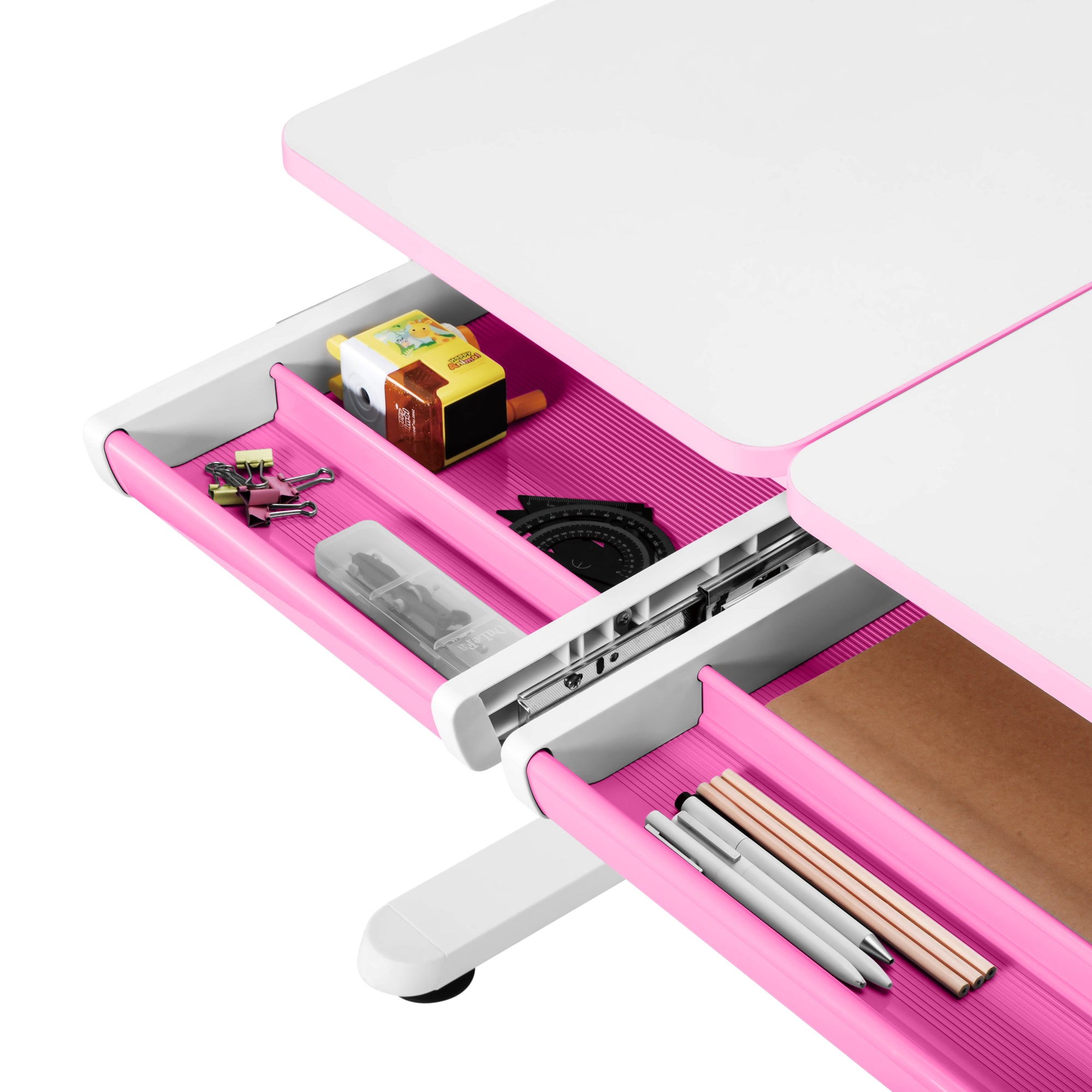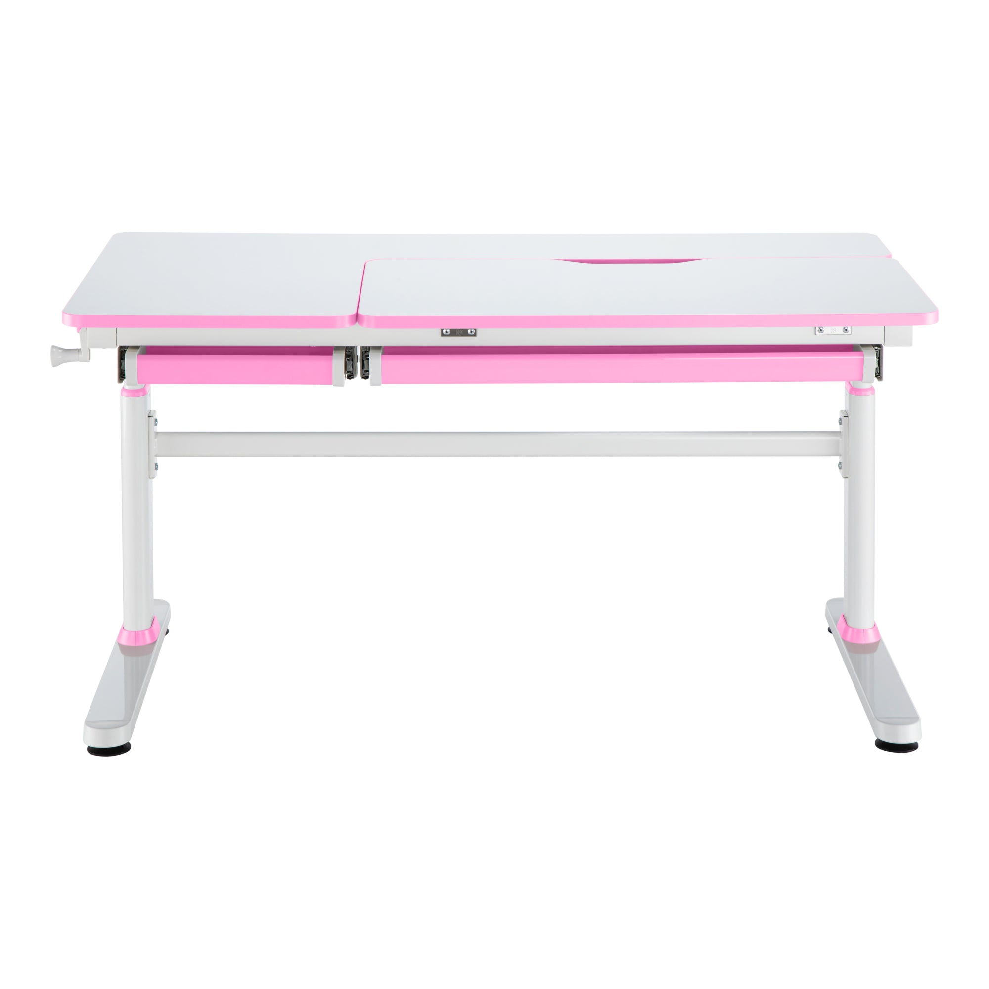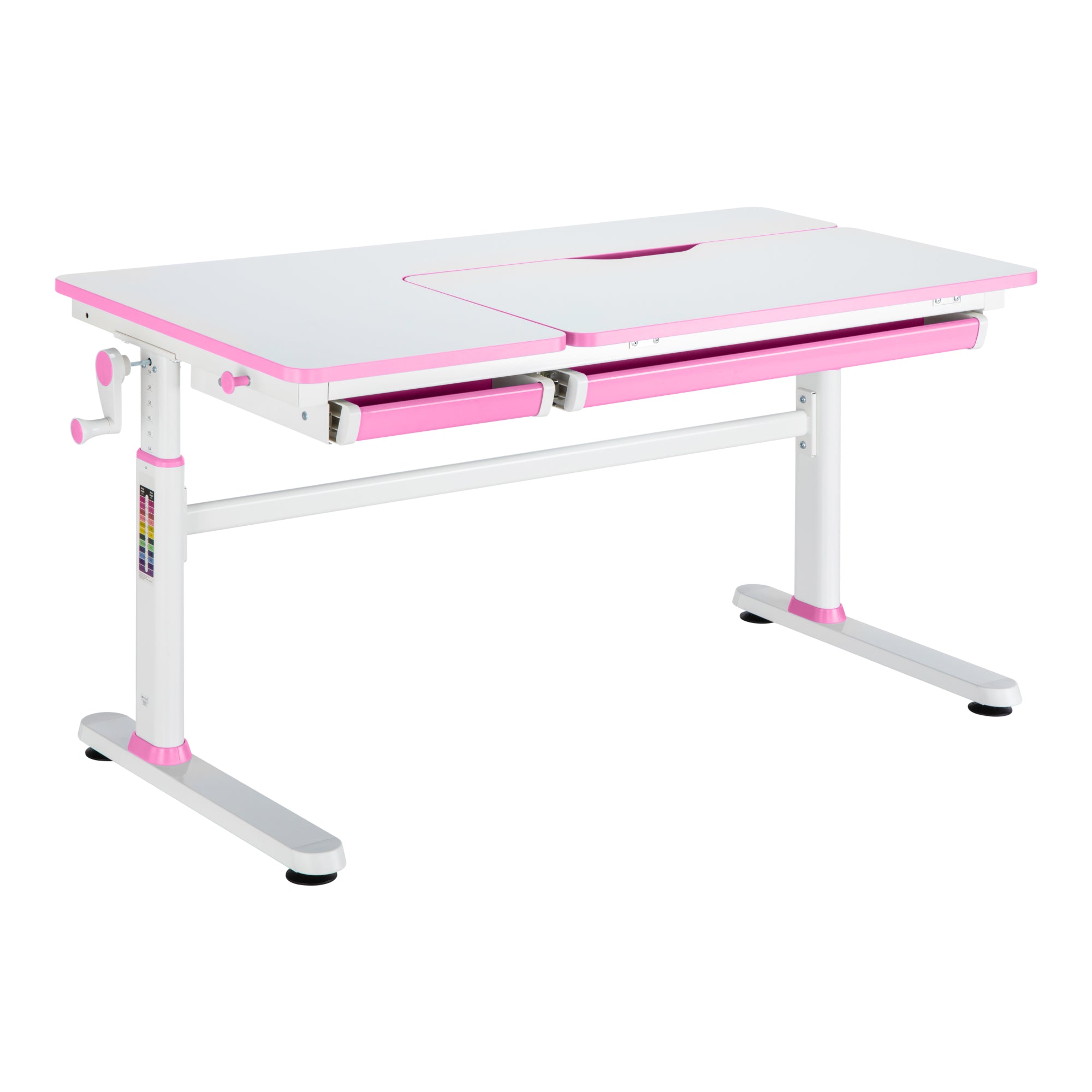 Notre bureau réglable s'adapte à la croissance et aux besoins de votre enfant et son design attrayant et sa fonctionnalité en font le choix idéal pour toute chambre d'enfant. La manivelle amovible permet de régler la hauteur pour une position assise ergonomique. Une partie du plateau de travail est inclinable de 0 à 50 degrés, favorisant une posture optimale pour lire, dessiner ou écrire. Deux tiroirs spacieux offrent un espace de rangement pour les fournitures scolaires, tandis que son crochet latéral permet de suspendre les sacs.