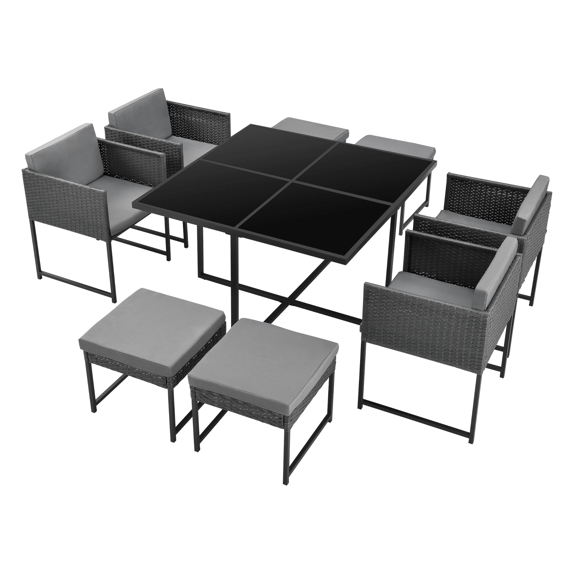 Les meubles en polyrotin créent une ambiance chaleureuse dans le jardin, sur la terrasse ou sous le porche. Vous pourrez vous détendre à la fin d'une longue journée dans le fauteuil en toute tranquillité ou bien inviter des amis pour l'apéro en été. Les fauteuils et les tabourets se rangent sous la table, ainsi vous pourrez même économiser de la place.