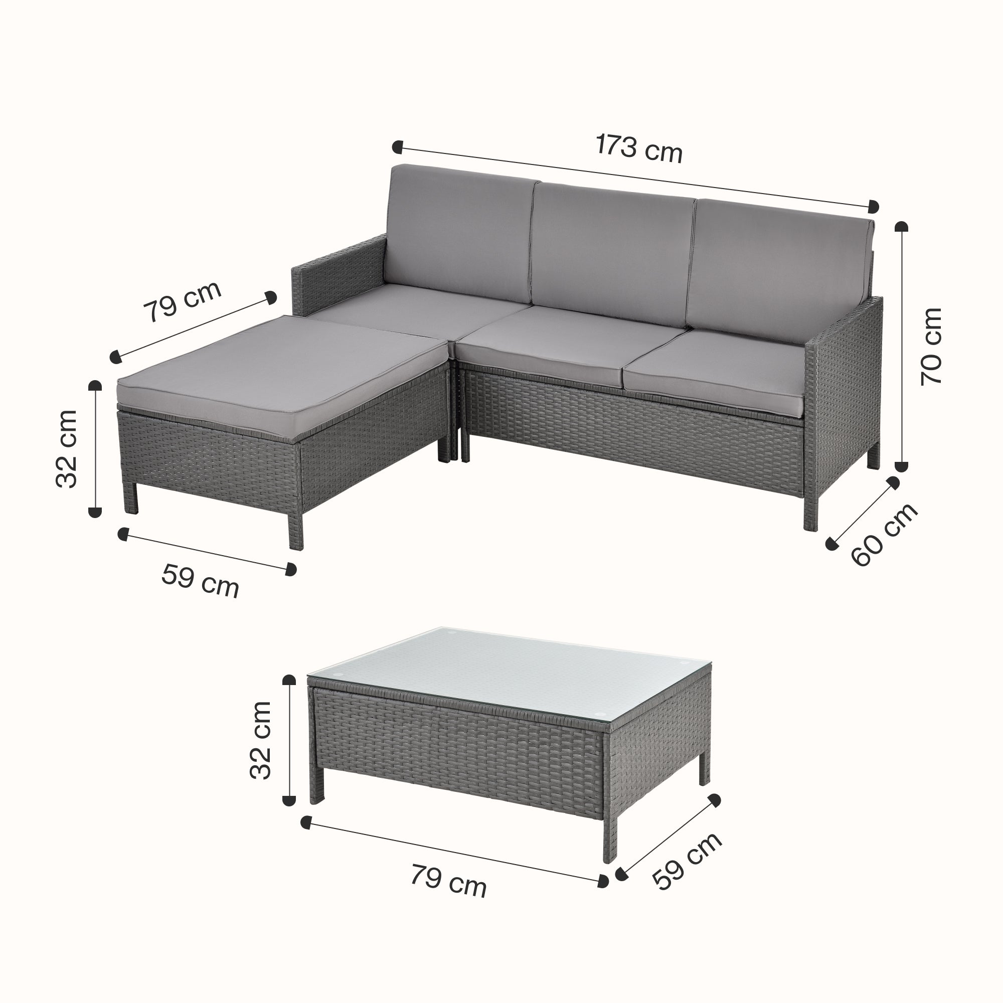 - table basse (longueur x largeur x hauteur) : 79 x 59 x 32 cm