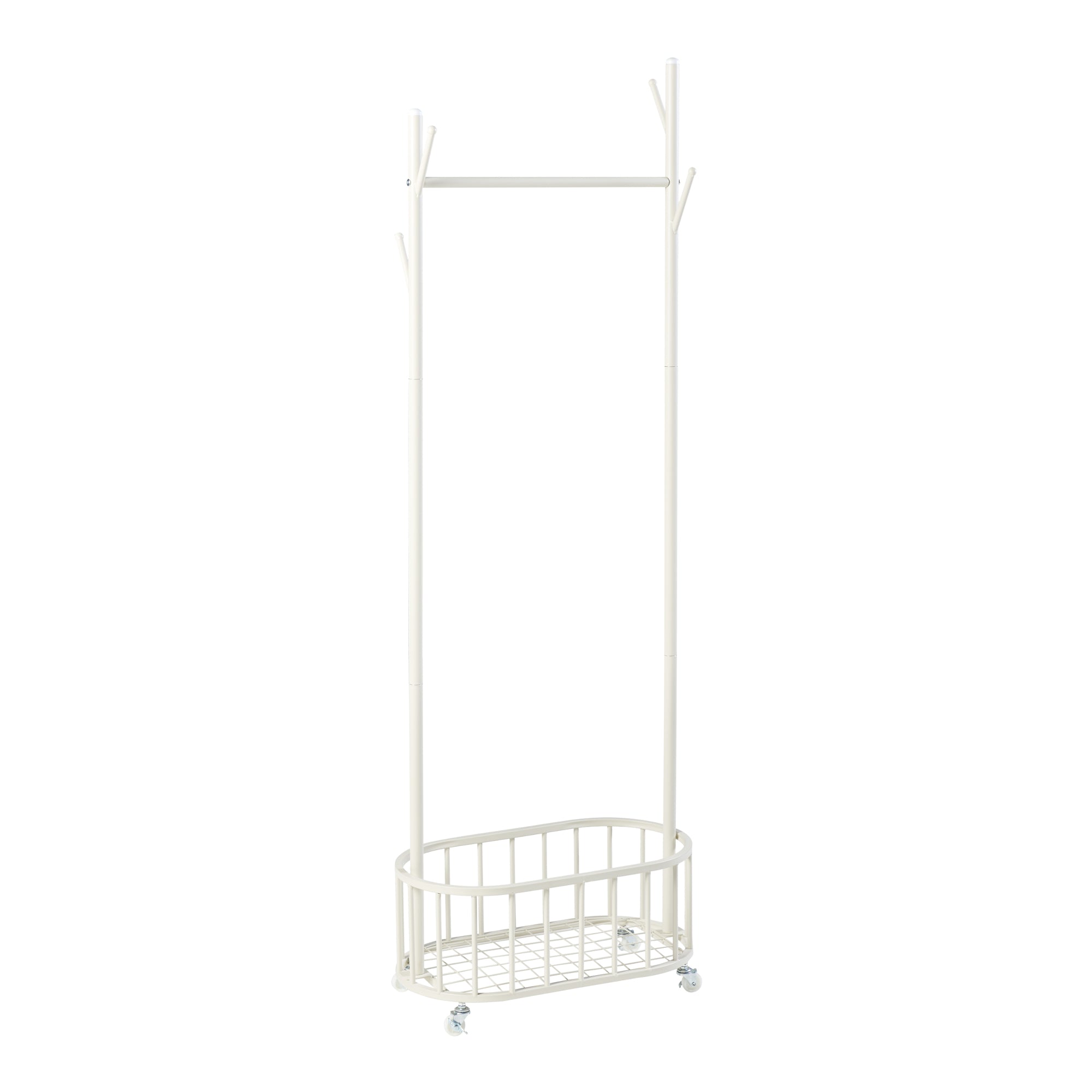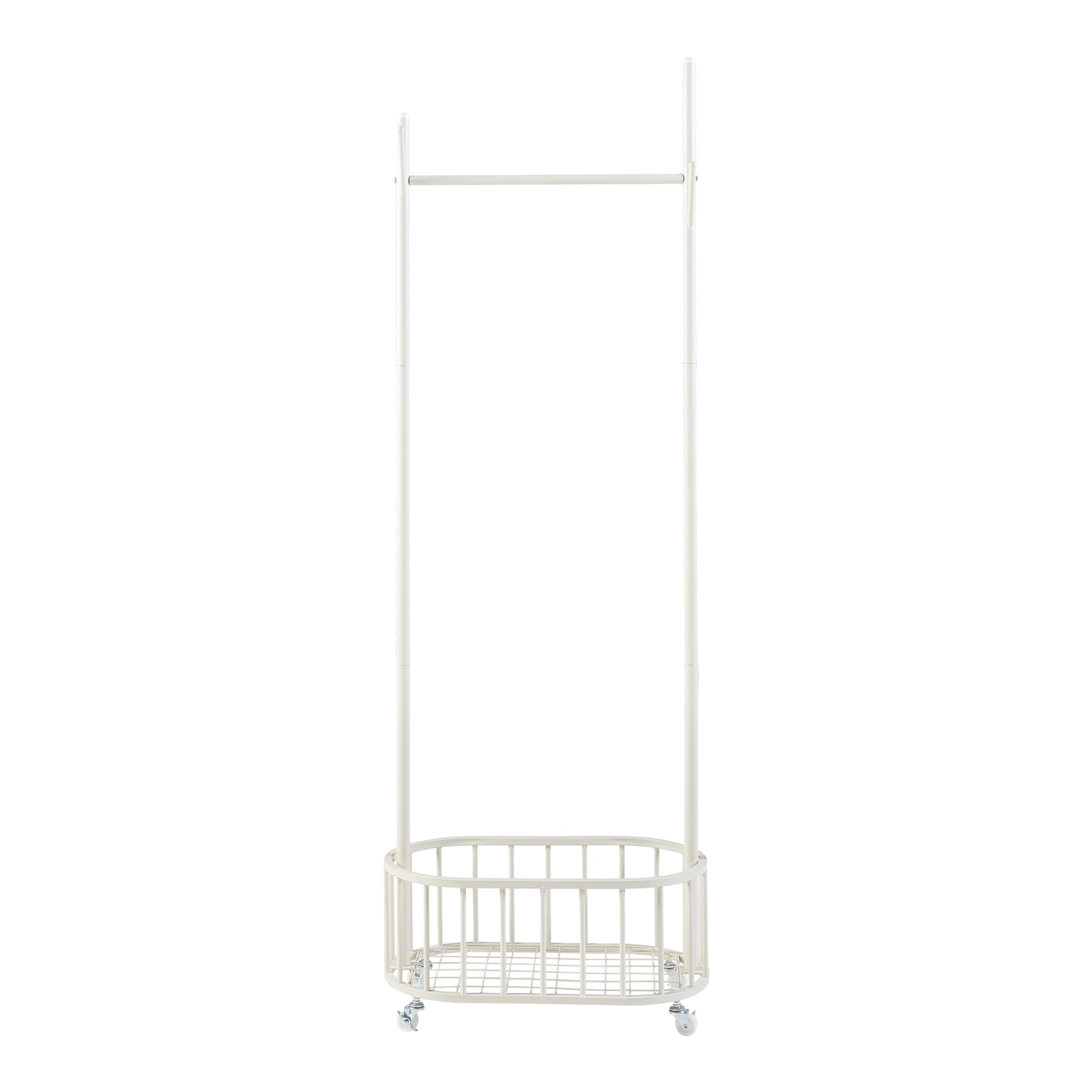 Het praktische kledingrek op wielen is snel en eenvoudig op te zetten. Hij beschikt over een kledingroede, een geïntegreerde mand en in totaal 4 kapstokhaken.